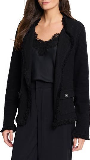 Fringe trim highlights the contemporary silhouette of a lightweight knit jacket that's a refined addition to your everyday style.