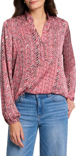 Move stylishly from desk to dinner in this blousy split-neck top that's stamped with an eye-catching herringbone print.