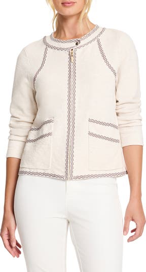 Patterned stitching contrasts this structured knit jacket updated with a sporty front zip for easy layering and golden hardware for polish.