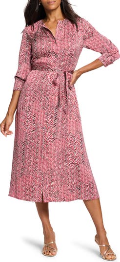 A colorful herringbone pattern plays up the contemporary charm of this breezy shirtdress cinched with a matching tie belt.