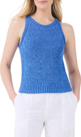 Thicker yarn creates a unique texture on this airy openwork sweater knit in a relaxed fit and sleeveless profile.