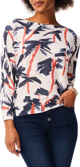 A tropical-inspired print lends visual intrigue to a stylish sweater knit from a supersoft cotton blend.