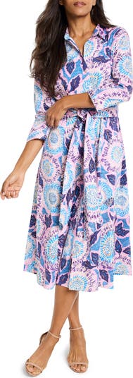 Colorful sketched flowers bloom across this flowy cotton-blend shirtdress made with handy pockets and easy-moving stretch.