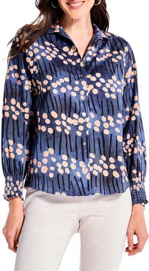 Such a great addition to my wardrobe; a splurge but worth it. The cotton fabric is soft to the touch, the print is gorgeous, and the smocking on the sleeves and slight ruffled cuffs add a feminine touch. Love the tailored fit and it’s comfortable, too. Highly recommend!