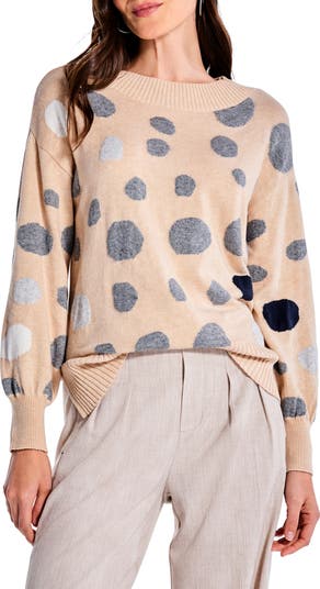 Dropped shoulders frame this slouchy cotton-blend sweater patterned in lively dots.