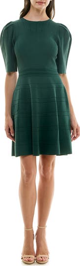 Transition effortlessly through the seasons in this detail-rich sweater dress designed with a charming fit-and-flare silhouette and dramatic gathered sleeves for a playful finish.