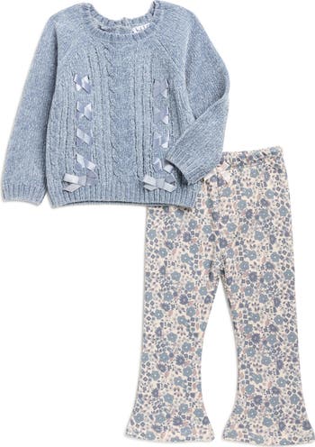 Lace-and-bow detailing adds a darling touch to this chenille cable-knit sweater paired with floral flare-leg pants made just for your little one.