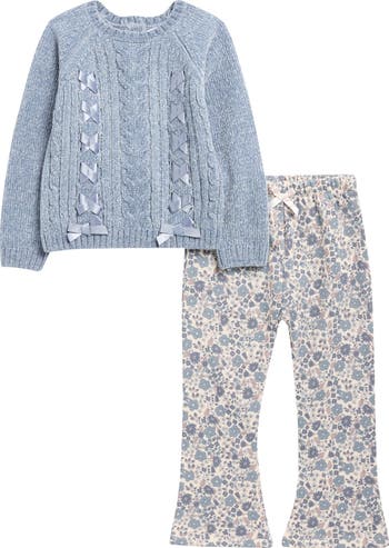 Lace-and-bow detailing adds a darling touch to this chenille cable-knit sweater paired with floral flare-leg pants made just for your little one.