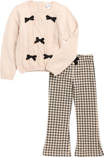 Statement bows add a darling touch to this chenille cable-knit sweater paired with houndstooth flare-leg pants made just for your little one.
