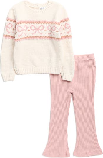 A bow-knit design adds a darling touch to this chenille sweater paired with rib-knit flare-leg pants made just for your little one.