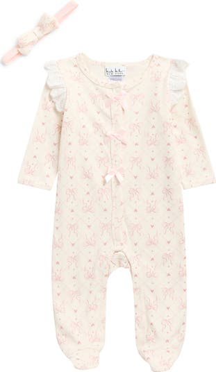 Give your little one sweet style with this adorable bow-printed footie and headband set cut from soft cotton-blend jersey.