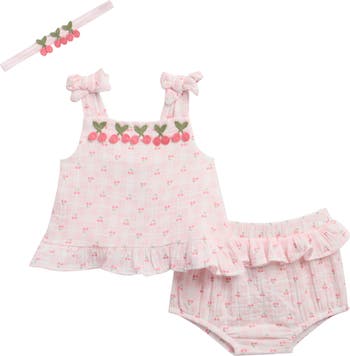 Sweeten baby's wardrobe with this frilly, cherry-adorned cotton set that pairs a tank with matching bloomers and a headband.