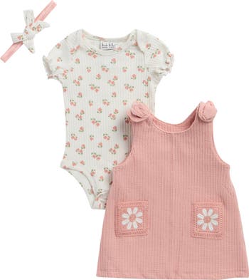 Give your little one sweet style with this coordinated three-piece set including a floral bodysuit, embroidered jumper and matching headband.