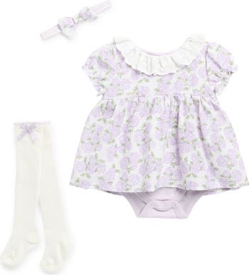 Coordinating socks and headband add sweet finishing touches to the floral-print dress in this set that has baby looking adorable as ever.