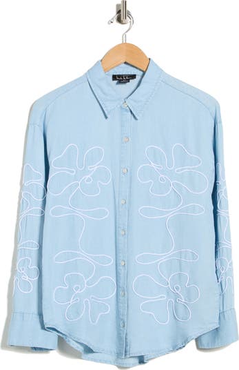 Corded flowers boost the charm of this long-sleeve button-up shirt cut from lightweight chambray in a comfortably relaxed fit.