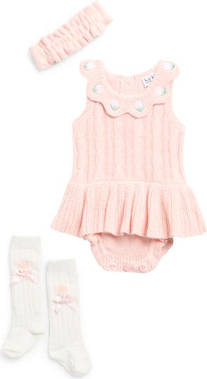 Give your little one sweet style with this three-piece set including an embroidered cotton sweater-knit romper, a ruffled headband and coordinating socks.