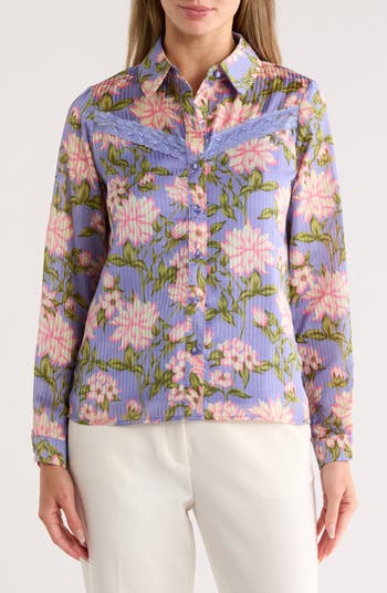 A bold floral print and inset lace add whimsical romance to this Western-inspired shirt highlighted by shimmery shadow stripes.