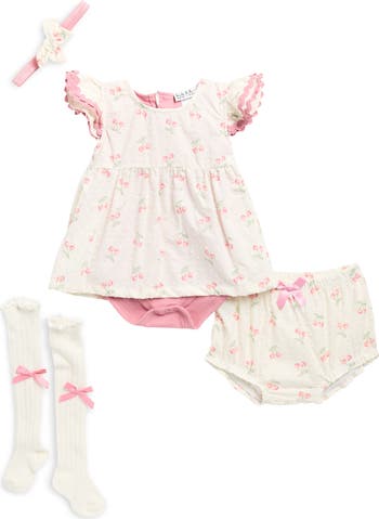 Swiss clip dots, lovely bows and cherries add sweet finishing touches to a matching set that has baby looking adorable as ever.