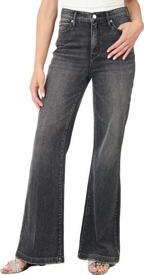 Add drama to your denim rotation with these flare-leg jeans made with a mid-rise waist and distressing around the wide hem for a relaxed, casual finish.
