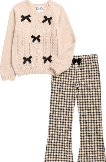 Statement bows add a darling touch to this chenille cable-knit sweater paired with houndstooth flare-leg pants made just for your little one.