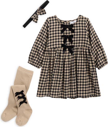 Buffalo plaid and velvet bows charm a baby-approved set featuring a long-sleeve dress paired with coordinating socks and a cute headband.