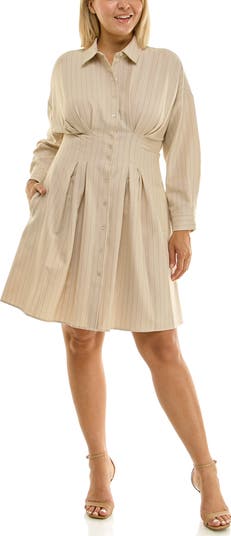 Blousy long sleeves elegantly frame this staple shirtdress defined at the waist by crisp box pleats.