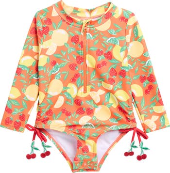 Protect your little one's skin from sun, sand and surf in this adorable long-sleeve rashguard featuring side bows and an easy snap-bottom closure.