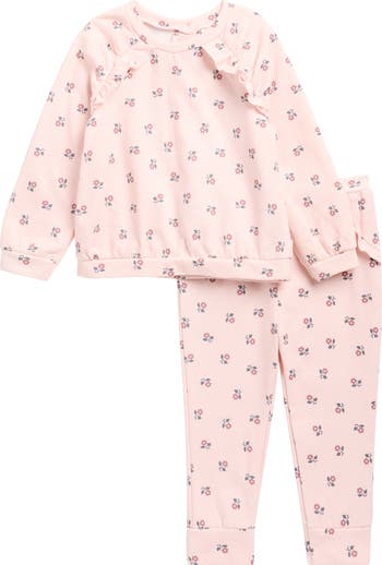 This charming set for your little one features a ruffle-trimmed sweatshirt paired with coordinating pants with floral print.