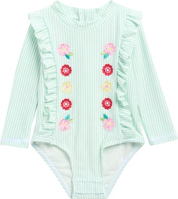 Baby's beach-day outings are incomplete without this darling one-piece rashguard designed with frilly ruffles and embroidered blooms.