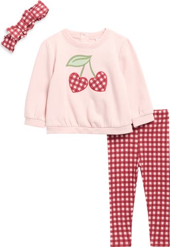 Keep your little one looking sweet and feeling cozy in this three-piece set including a soft fleece sweatshirt, coordinating pants and a matching headband.