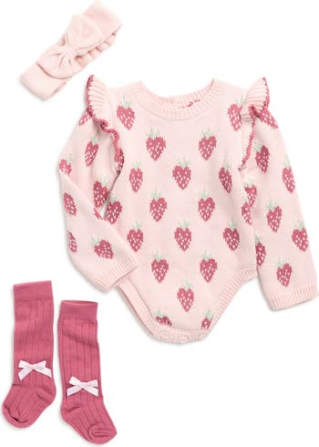 Give your little one sweet style with this cozy three-piece set including a soft cotton sweater-knit bodysuit, bow-embellished headband and socks.