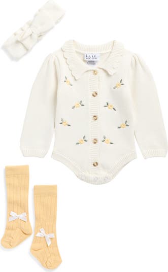 Give your little one sweet style with this three-piece set including a sweater-knit bodysuit embroidered with flowers, a coordinating headband and socks.