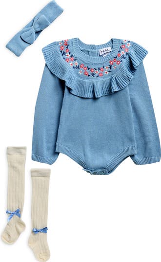Baby will look oh-so-sweet in a three-piece set pairing a sweater-styled bodysuit with a matching headband and coordinating socks.