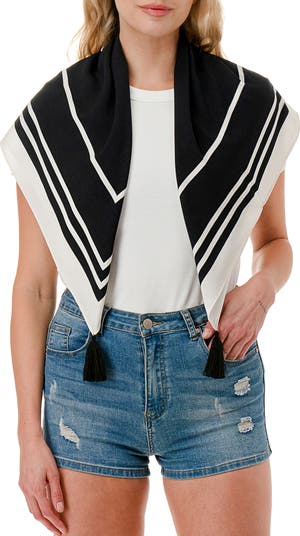 A lightweight square border-print scarf finished with tassels shifts effortlessly from neck accessory to top in a stylish snap.