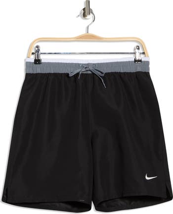 Make a splash in these sporty colorblock swim trunks featuring a comfortable elastic-drawstring waist and handy side pockets.