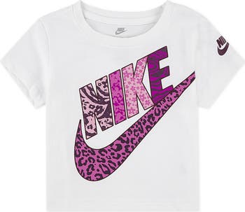 The iconic Nike logo gets a jazzy mixed-print makeover on this crewneck kids' tee made from a soft cotton blend.