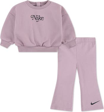 Nike's signature swoosh motif has baby sporting an athletic-meets-cozy look in this sweatshirt and leggings set made from comfy cotton-blend fleece.