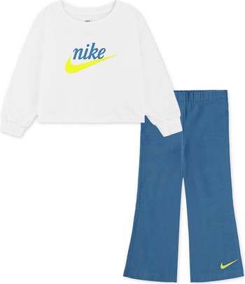 A heart Swoosh logo details a long-sleeve T-shirt that’s paired with coordinating flared leggings for a sporty look.
