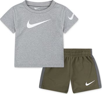 Big on comfort, bold on style–this jersey T-shirt and mesh shorts set with signature swoosh branding is a go-to for nonstop fun.