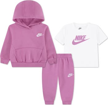 The branding stands out boldly on this kid-sized set of a fleece hoodie, T-shirt and joggers made from a supersoft cotton blend.