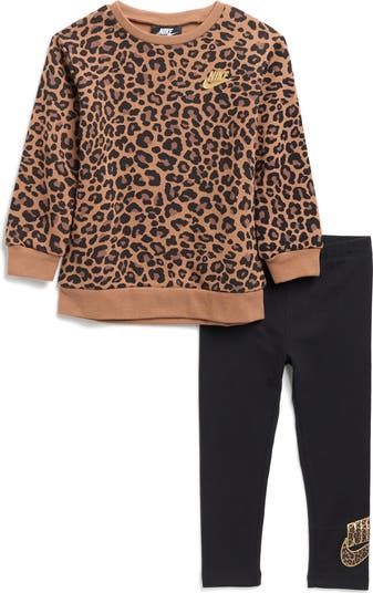 Give your tot fierce style with this two-piece set featuring a leopard-patterned fleece pullover and coordinating leggings.
