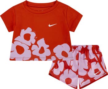 Vibrant floral print brings bold energy to this comfortable set that pairs an active-ready T-shirt with coordinating shorts.
