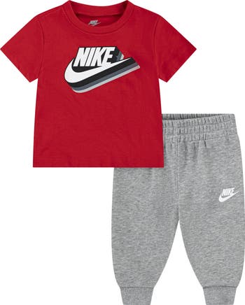 Nike's signature logo adds sporty look to a T-shirt and pants set that move with your little one whether at practice or on the playground.