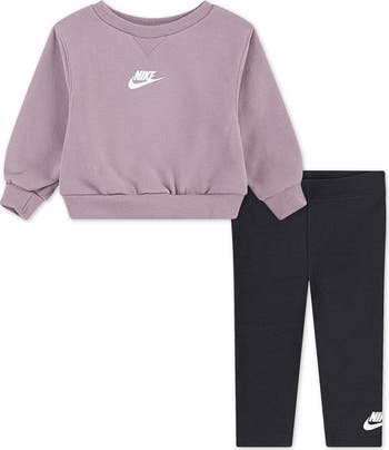 Nike's signature Swoosh logo brings heritage appeal to a sweatshirt and leggings set made from a cotton blend to keep baby comfortable.