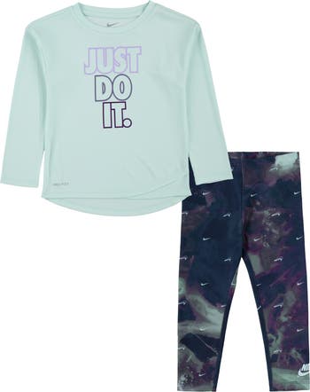 Keep your little one comfy in this long-sleeve T-shirt and leggings set cut from Dri-FIT moisture-wicking performance fabric.