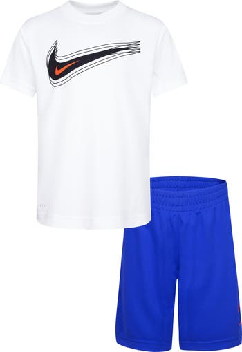 Dri-FIT technology wicks away their sweat in a sporty set from Nike featuring a crewneck T-shirt and pull-on shorts.