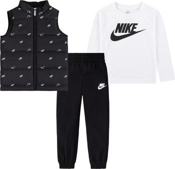Sometimes getting out the door with a little one can be a chore but thanks to this sporty, cold-weather set—that pairs a puffer vest with a logo T-shirt and fleece joggers—at least getting them dressed is less of a headache.