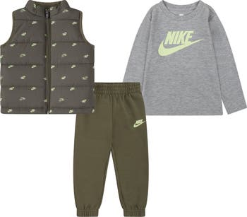 Sometimes getting out the door with a little one can be a chore but thanks to this sporty, cold-weather set—that pairs a puffer vest with a logo T-shirt and fleece joggers—at least getting them dressed is less of a headache.