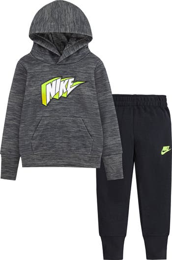 A contemporary swoosh logo stamps a signature finish on a cozy set of fleece separates perfect for the playground.