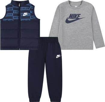 Your budding athlete will move and play comfortably in this action-ready set that pairs a lightweight puffer vest with a long-sleeve T-shirt and joggers.